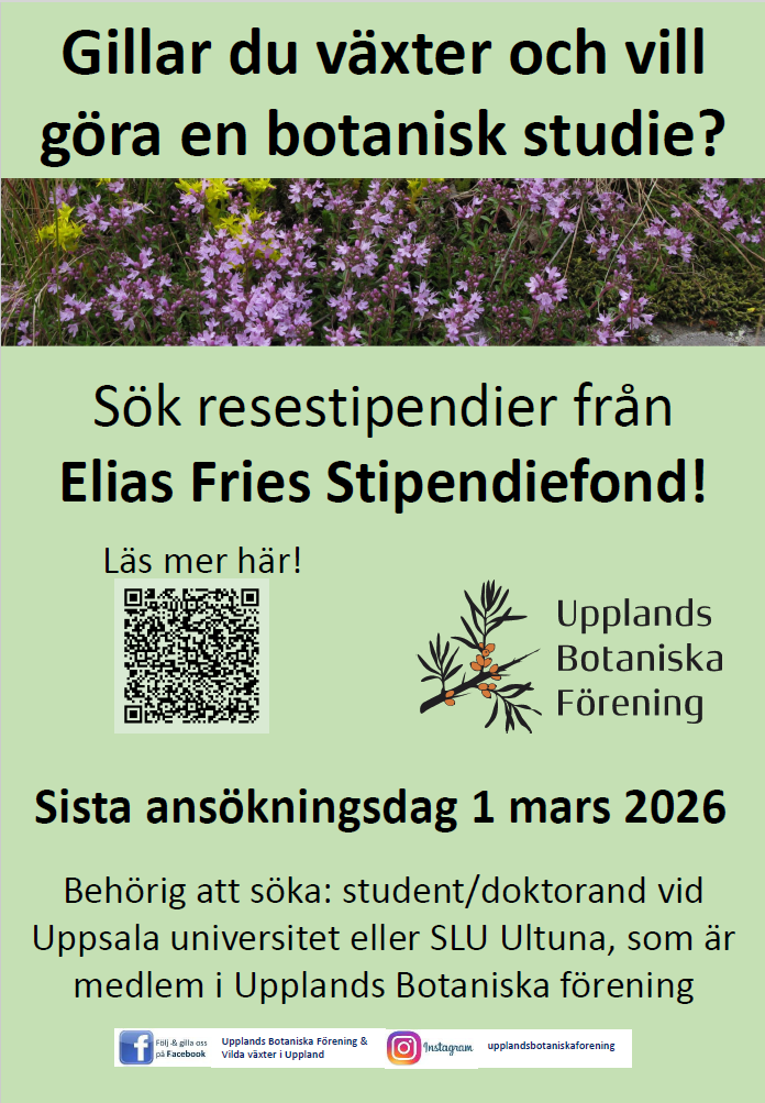 Stiftelsen Elias Fries Stipendiefond har som syfte att stödja botanisk undersökning vid Uppsala Universitet och SLU. Stiftelsen utlyser nu stipendier på upp till 10 000 kr för resor inom Skandinavien med botaniskt ändamål. Det kan vara exempelvis datainsamling i forsknings- eller studentprojekt, botanisk inventering, besök vid herbarier och liknande. Undersökningen ska gälla den vilda floran, inklusive mossor och alger.